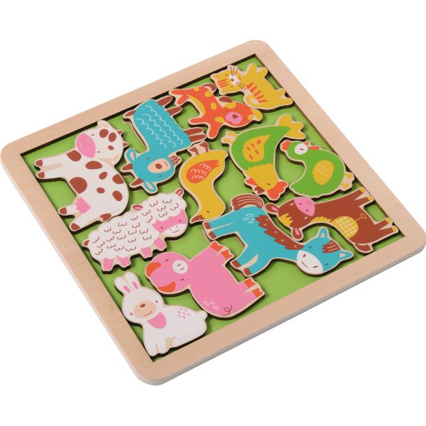 Daudzkrāsains koka pužļu komplekts ar piecām dažādām puzlēm vienā – ideāli piemērots bērniem gan mājās, gan bērnudārzā. Uz puzles pamatnes attēloti silueti, kas palīdz bērniem viegli atrast pareizo vietu katrai figūrai.