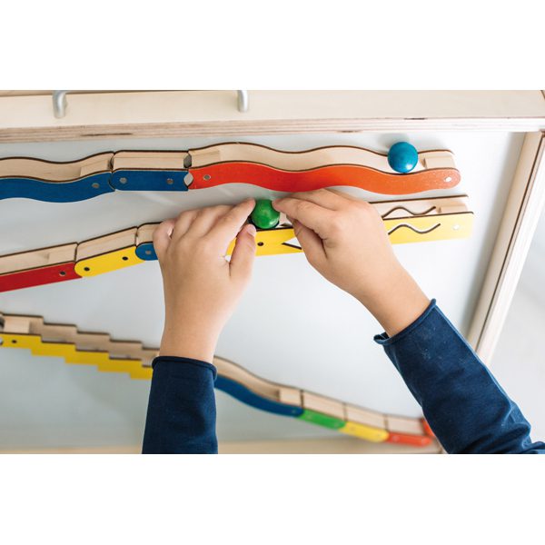 Inovatīvs rotaļu komplekts, kas apvieno magnētisko celiņu, radošo tāfeli un ērtu somiņu vienā. Komplektā ir 18 magnētiskās trases daļas un 7 krāsainas bumbiņas, kas ļauj bērniem izveidot dažādas trases un vērot, kā bumbiņas ripo pa dažādiem ceļiem. Magnētiskās saites notur trases gabaliņus stingri uz baltas virsmas, ļaujot bērniem eksperimentēt ar formām, slīpumiem un attālumiem, lai radītu jaunas trases. Somiņa darbojas arī kā magnētiskā tāfele, uz kuras var zīmēt ar krītiņiem vai izvietot magnētiņus.