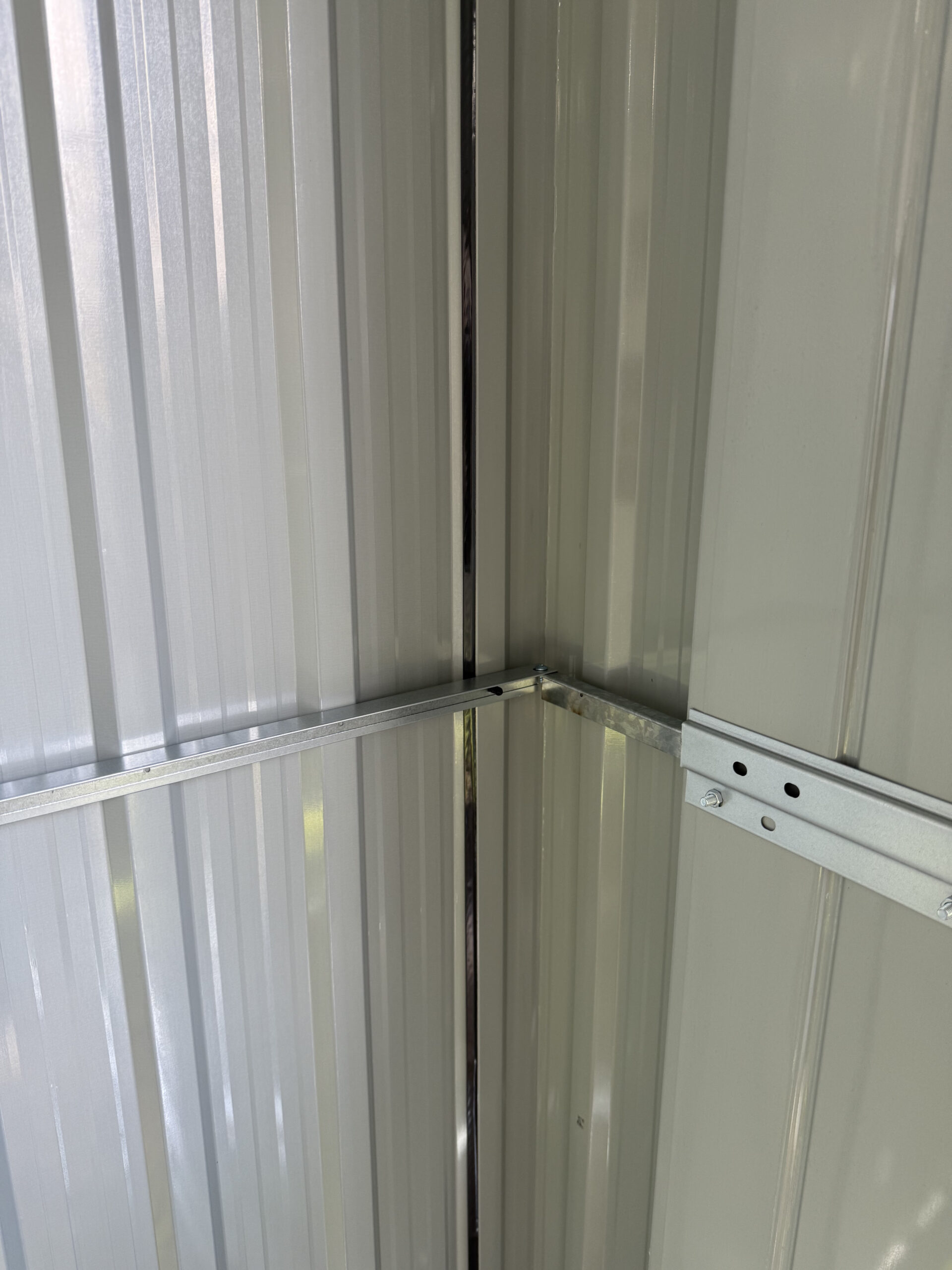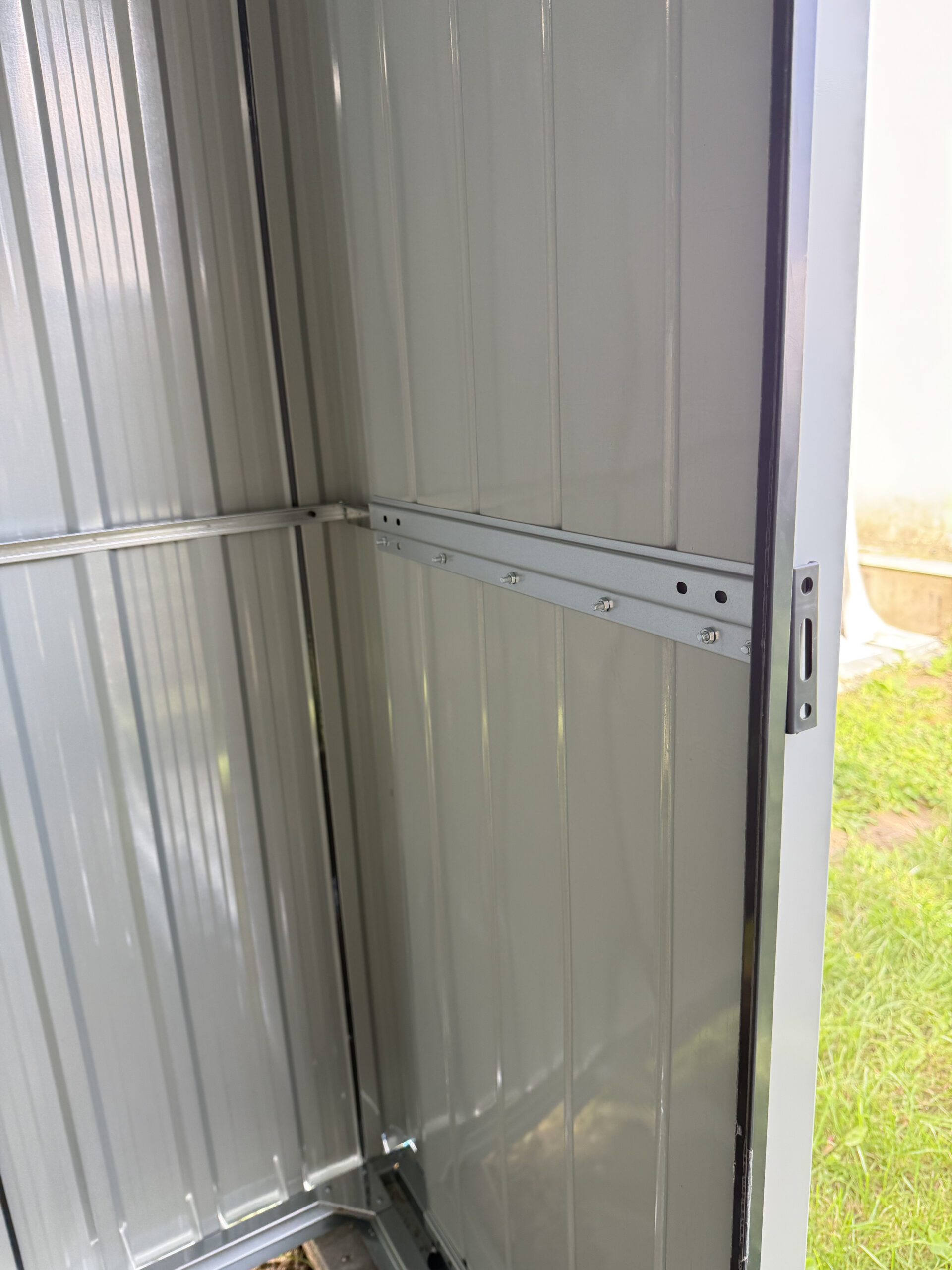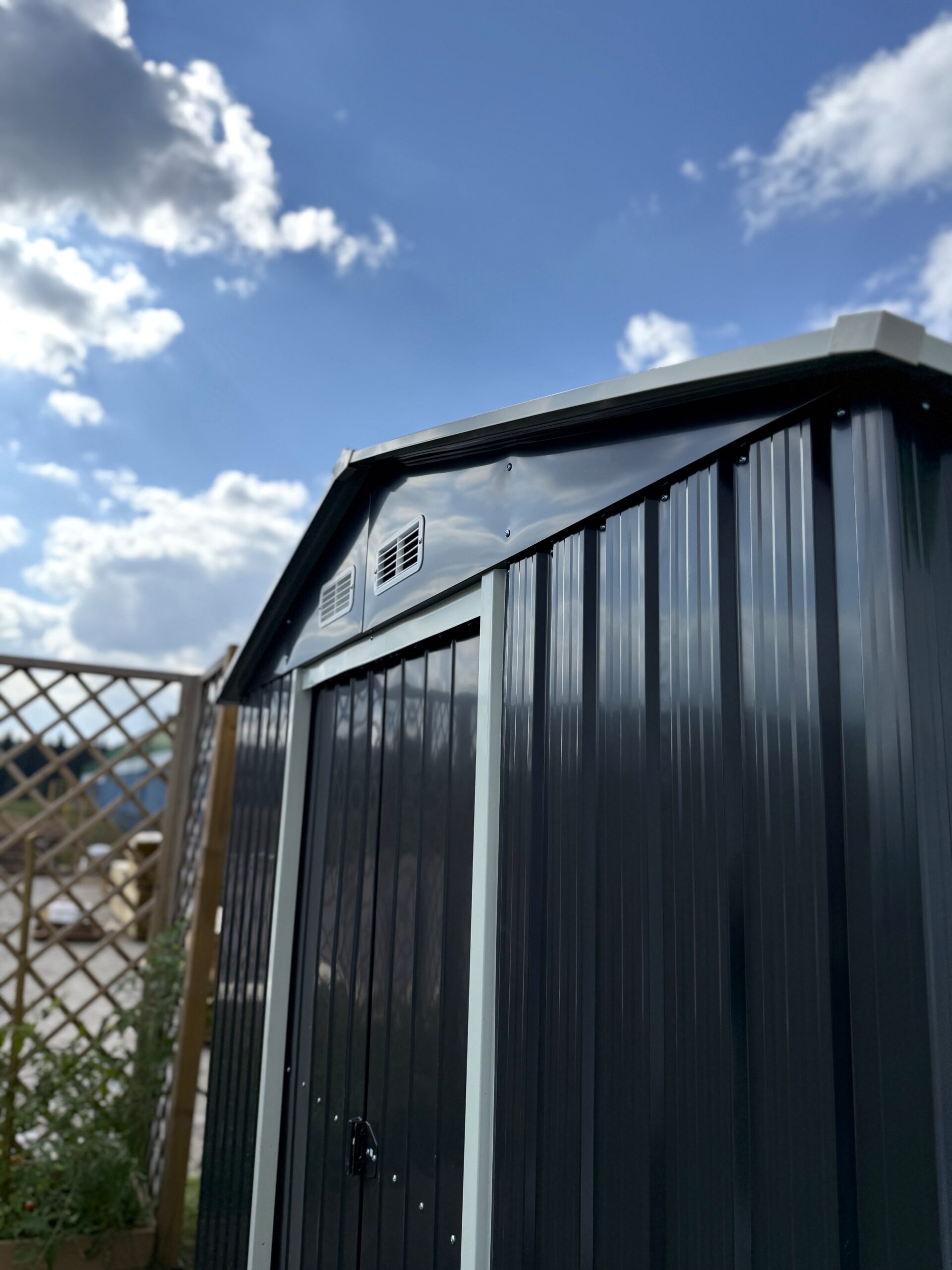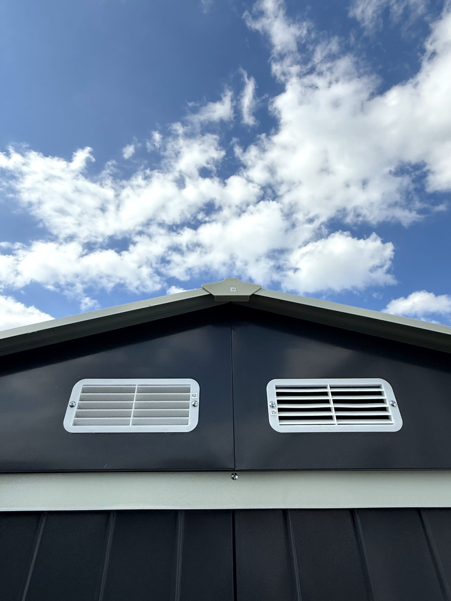 Ventilācijas atveres nodrošina gaisa cirkulāciju, pasargājot uzglabātos priekšmetus no mitruma un pelējuma. Šie atvērumi palīdz novērst nepatīkamas smakas un nodrošina, ka visi darbarīki ir sausi. Metāla šķūnītim ir bīdāmās durvis. Papildus drošību nodrošina durvju slēdzene.