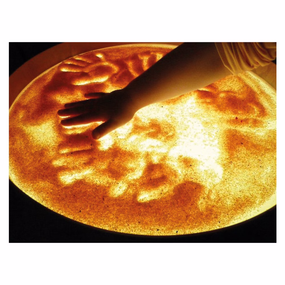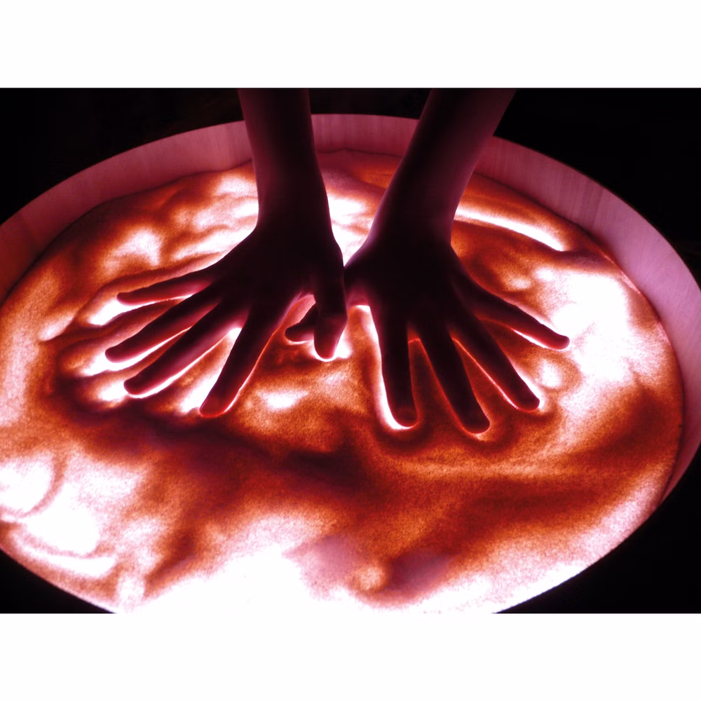 - Smalkā motorika un koncentrēšanās – zīmēšana ar smiltīm un gaismas efektiem ļauj bērniem koncentrēties un izpētīt savas sajūtas.